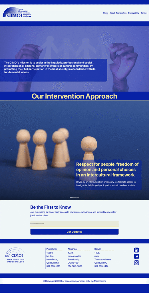 Rebranding project for CIMOI, a Montreal-based organization supporting integration and employability. The work included developing a refreshed visual identity and communication strategy to better reflect the organization’s mission, values, and connection with the community.